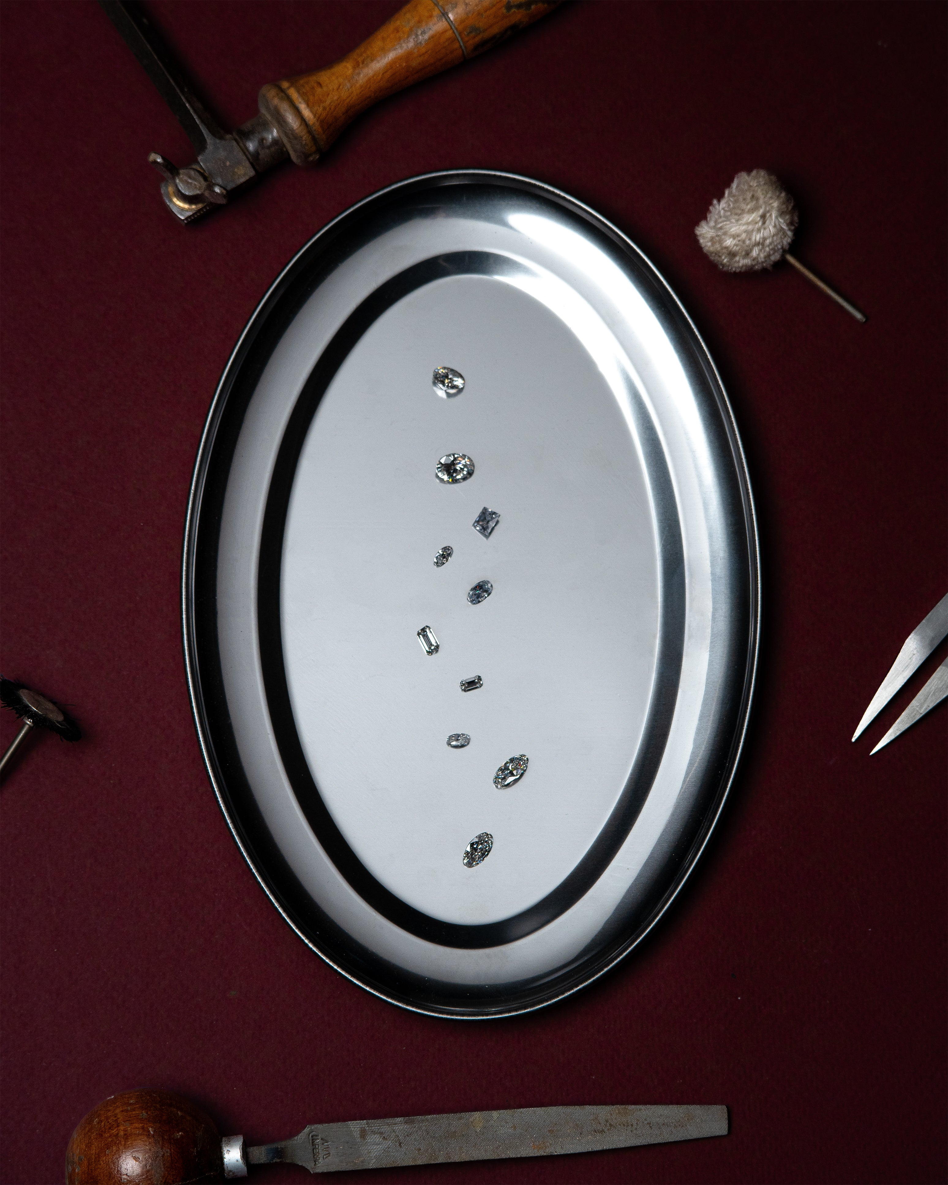 Trabalhamos com todo tipo de gema disponível atualmente no mercado (exceto zircônia). Em coleções específicas, utilizamos diamantes naturais, diamantes de laboratório, moissanite e outras gemas como safiras, rubis, esmeraldas etc.