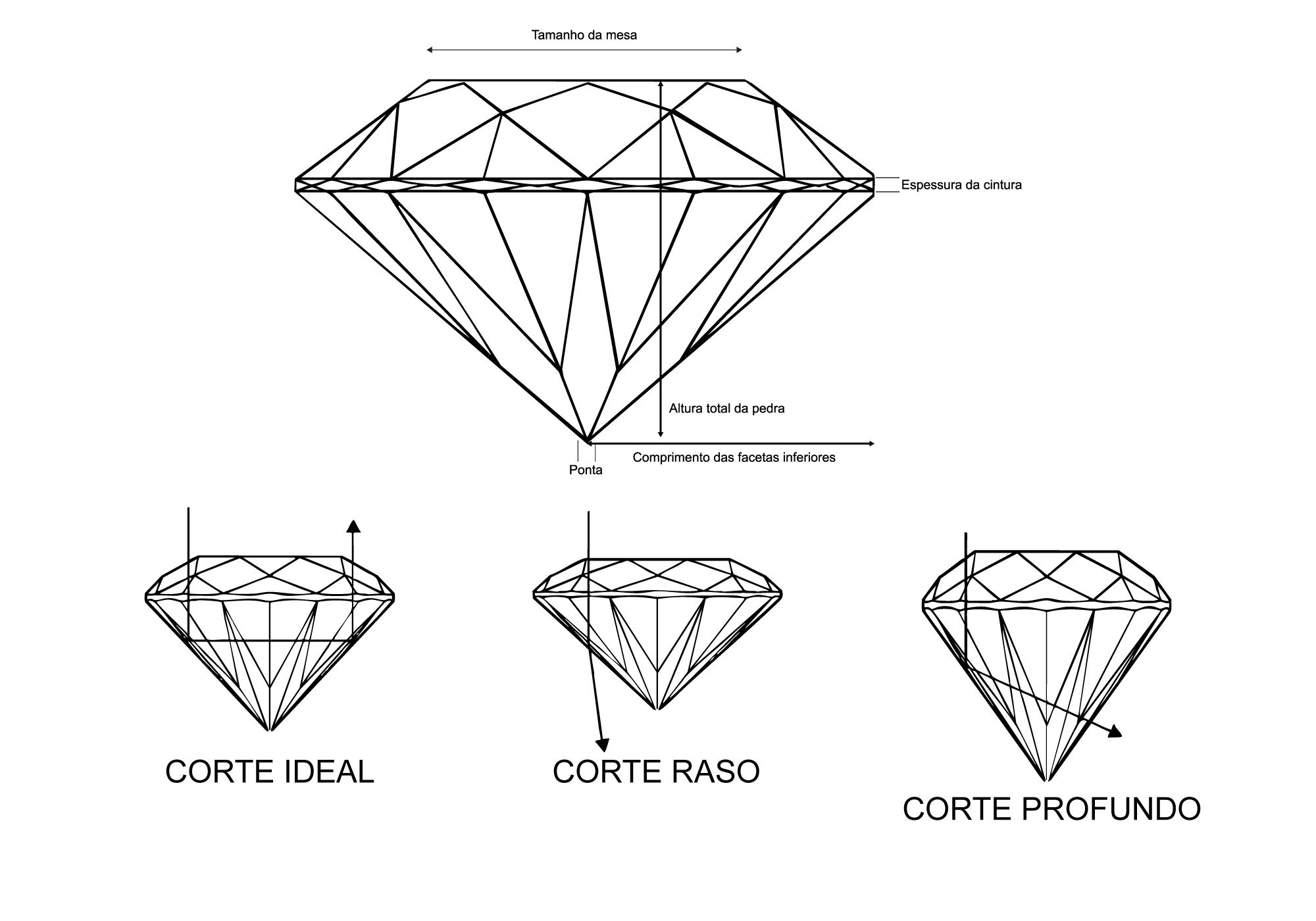 “Corte” não é o formato (oval, redondo, esmeralda). Corte é a qualidade da lapidação. Esse é um dos fatores mais importantes, porque é ele que determina o brilho do diamante.