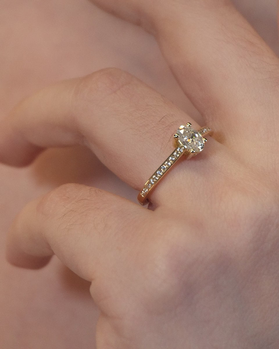 No centro, traz como destaque uma Moissanite central oval de 6x4mm, cravada por quatro garras delicadas.