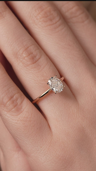 O anel Paleta aposta na força da simplicidade. Uma estrutura limpa, em ouro 18K polido, sustenta uma moissanite oval de 1,5ct com proporções generosas e brilho elevado. A cravação com quatro garras finas revela toda a lapidação da pedra, deixando que a luz entre com liberdade e valorize seus reflexos.
